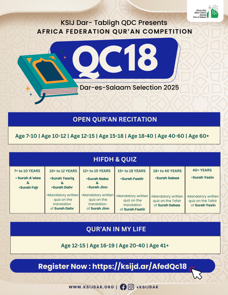 Join us for QC18, an exciting journey of Qur’an recitation, memorization, and reflection! Open to all age groups, the competition features categories in Qur’an Recitation, Hifdh & Quiz, and Qur’an in My Life.