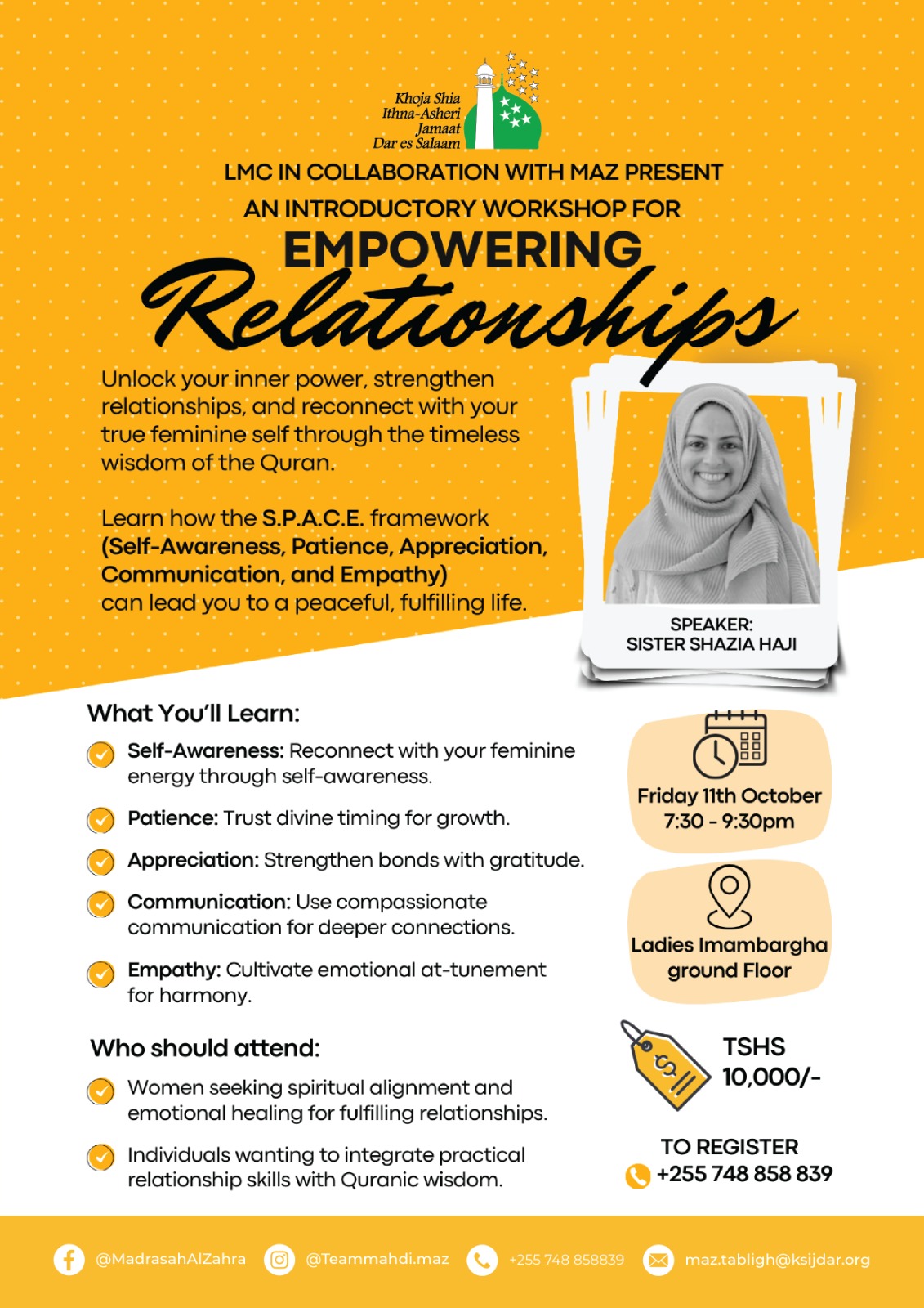 LMC IN COLLABORATION WITH MAZ PRESENT AN INTRODUCTORY WORKSHOP FOR EMPOWERING Relationships Unlock your inner power, strengthen relationships, and reconnect with your true feminine self through the timeless wisdom of the Quran. Learn how the S.P.A.C.E. framework (Self-Awareness, Patience, Appreciation, Communication, and Empathy) can lead you to a peaceful, fulfilling life. SPEAKER: SISTER SHAZIA HAJI […]