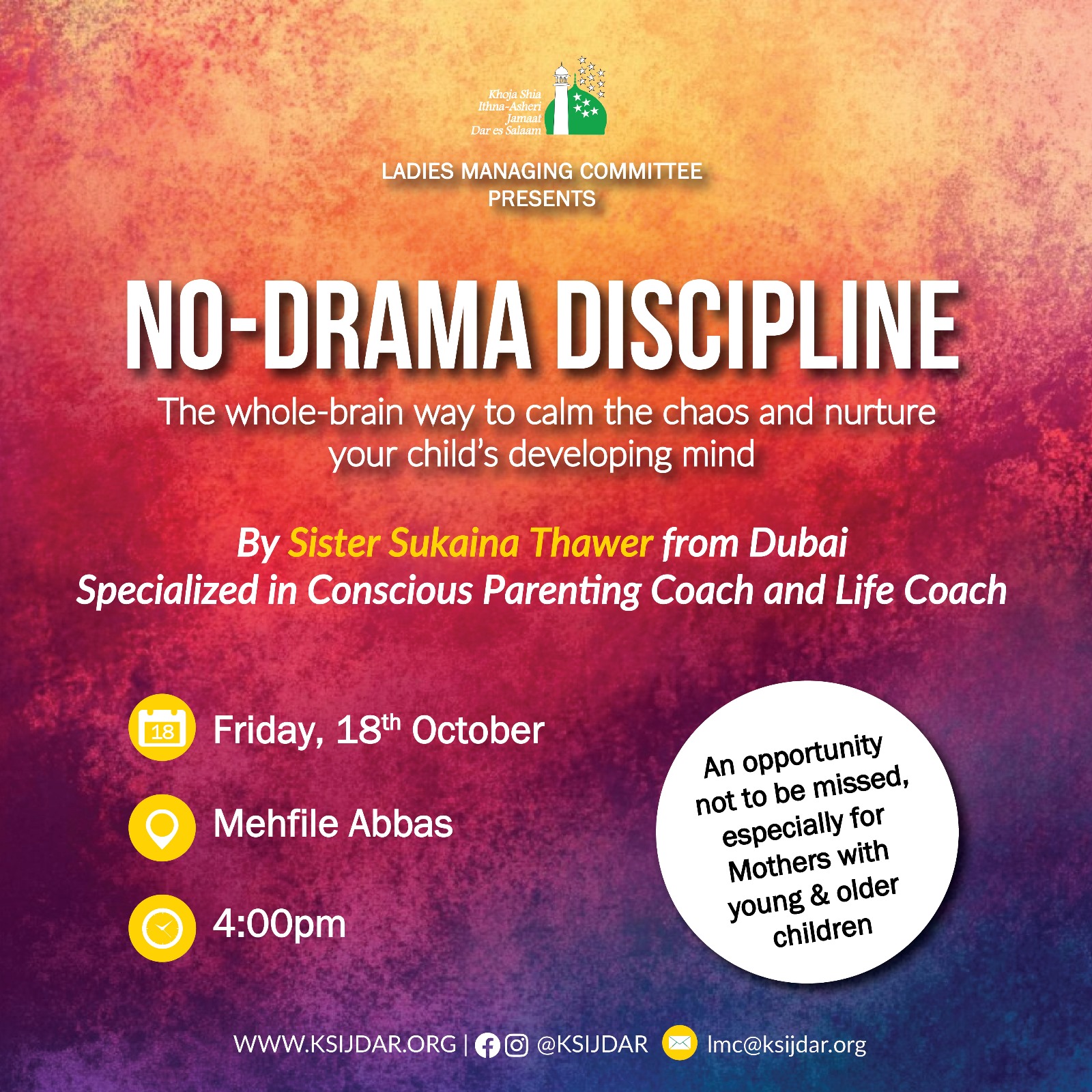 LADIES MANAGING COMMITTEE PRESENTS NO-DRAMA DISCIPLINE The whole-brain way to calm the chaos and nurture your child’s developing mind By Sister Sukaina Thawer from Dubai Specialized in Conscious Parenting Coach and Life Coach 18 Friday, 18th October Mehfile Abbas