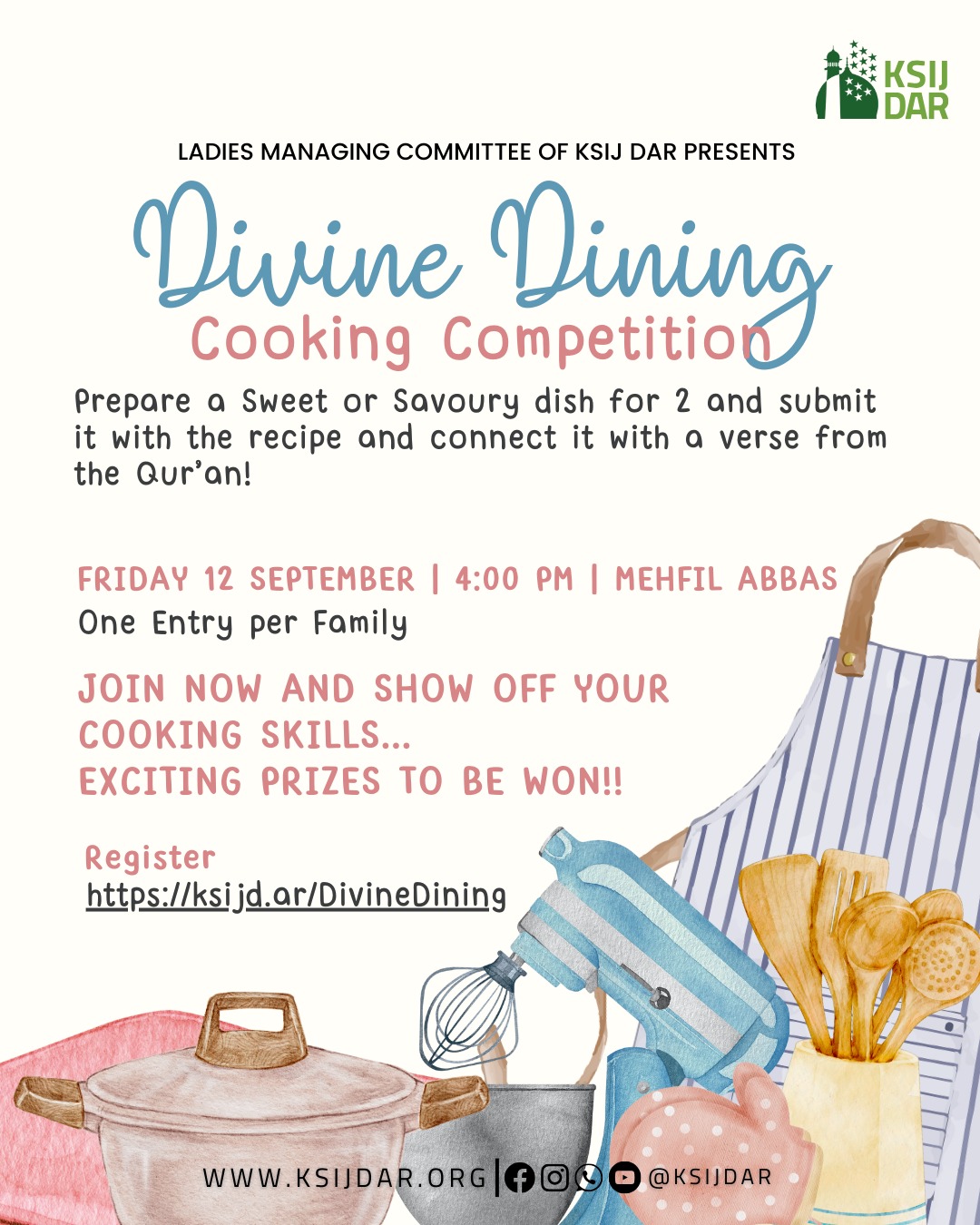 Mehfil-e-Abbas (as) Dar-es-Salaam, Tanzania, United Republic ofDivine Dining Cooking Competition Showcase your culinary talent by preparing a sweet or savory dish, linking it with a verse from the Holy Qur’an, and stand a chance to win exciting prizes! 🌟 👨👩👧 One entry per family