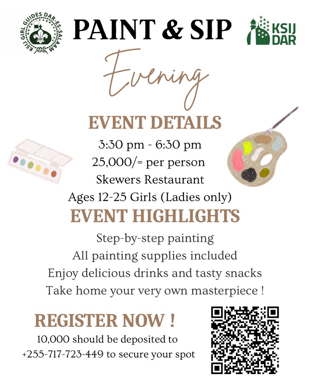 Skewers Restaurant Longido Street, Dar es Salaam, Dar es salam, Tanzania, United Republic ofKSIJ Girl Guides Dar es Salaam presents PAINT & SIP EVENING 🎨 An evening dedicated to creativity, relaxation, and connection. 25,000/= per person (Ages 12–25 girls) All painting materials will be provided.Light refreshments will be served. To register, please deposit 10,000/= to +255 717 723 449. Limited slots available — early registration is encouraged.