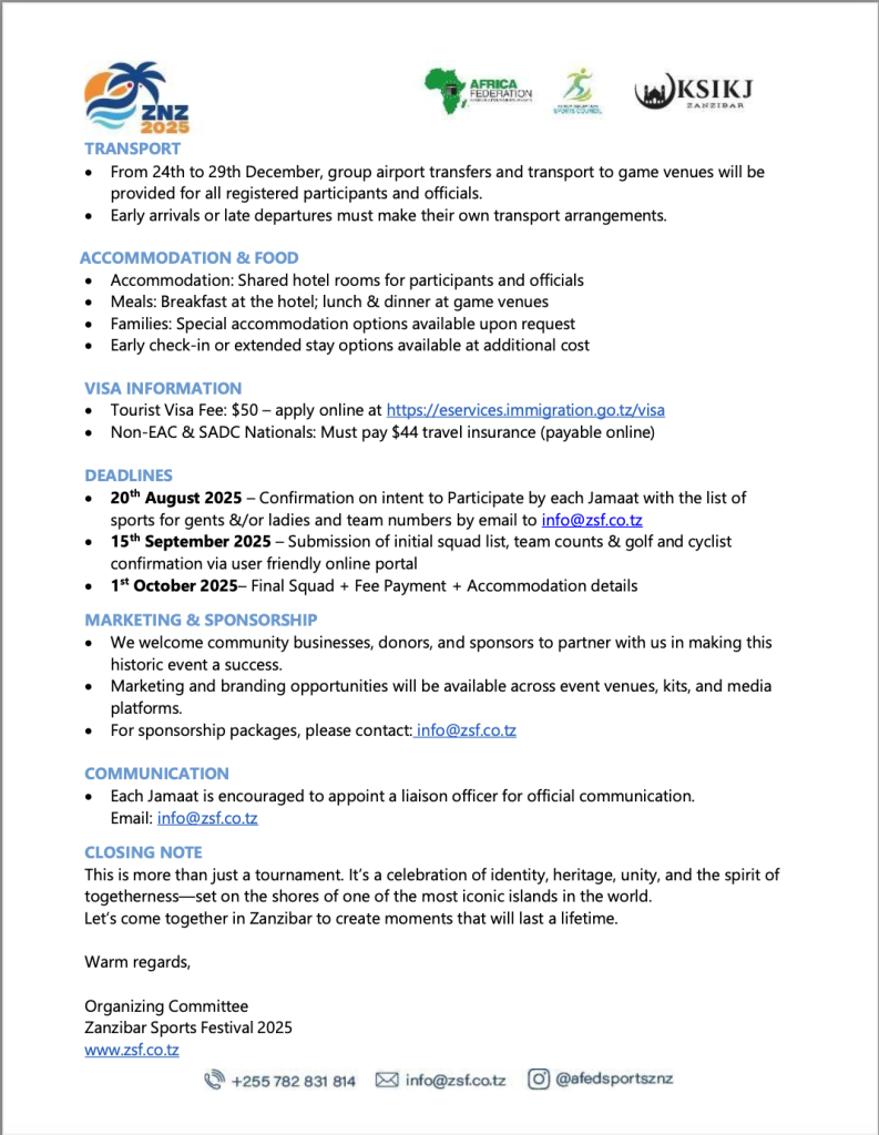 KSIJ Dar es Salaam and Union Sports Club are pleased to inform its members that registration is now open for participants and Spectators of the Zanzibar Sports Festival 2025, organized by the Africa Federation and hosted by the Khoja Shia Ithna-Asheri Kuwatul Islam Jamaat of Zanzibar.